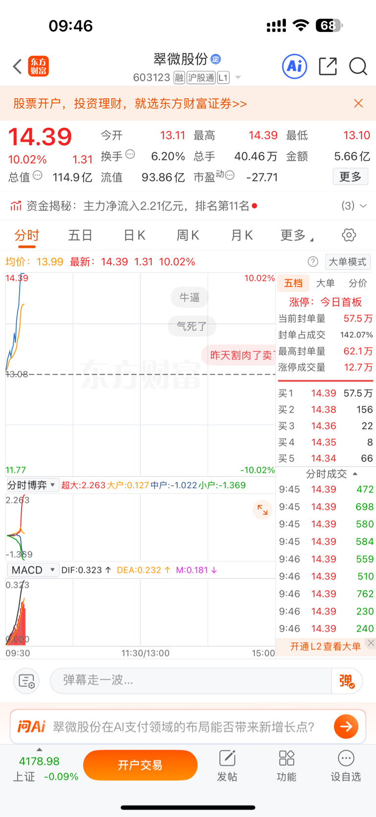 $旗天科技(SZ300061)$ 顺利又打板