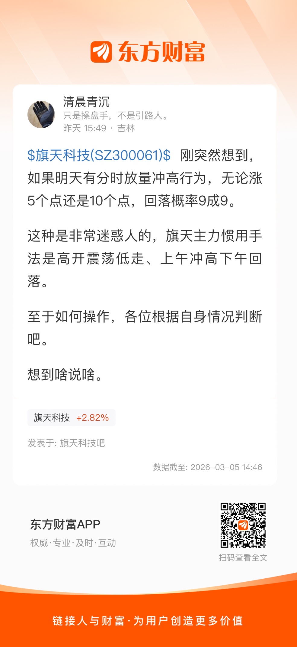 $旗天科技(SZ300061)$ 刚突然想到,如果明天有分时放量冲高行为,无论涨5个点还是10个点,回落概率9成9。