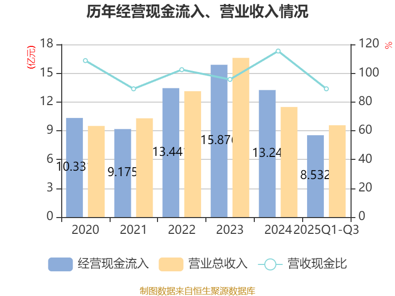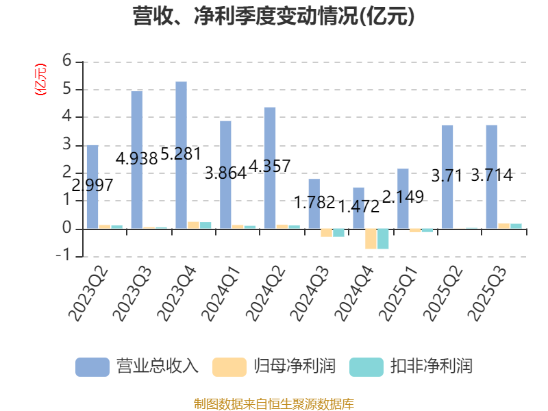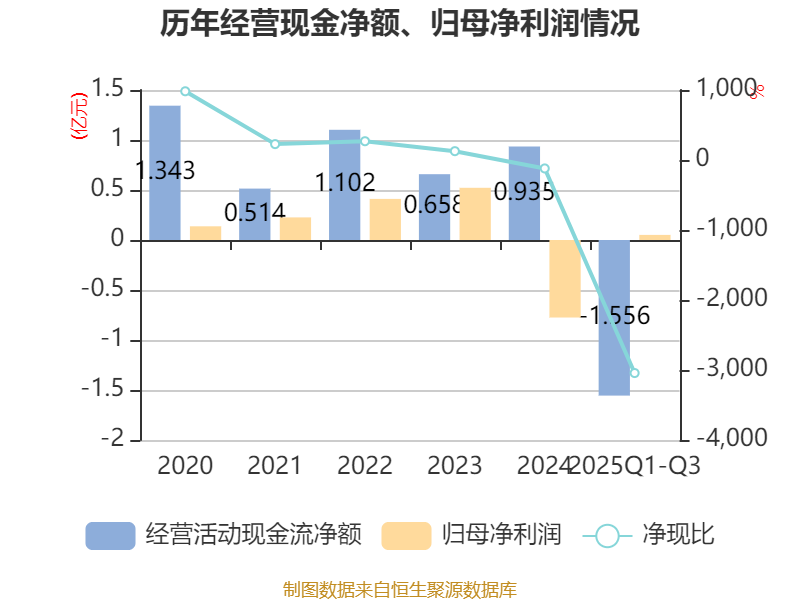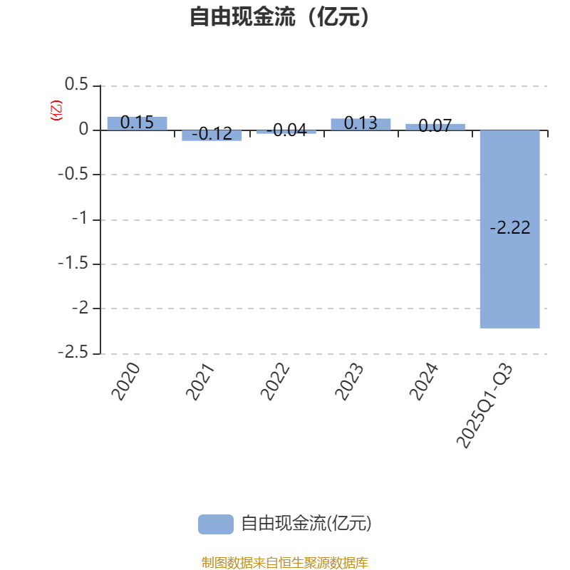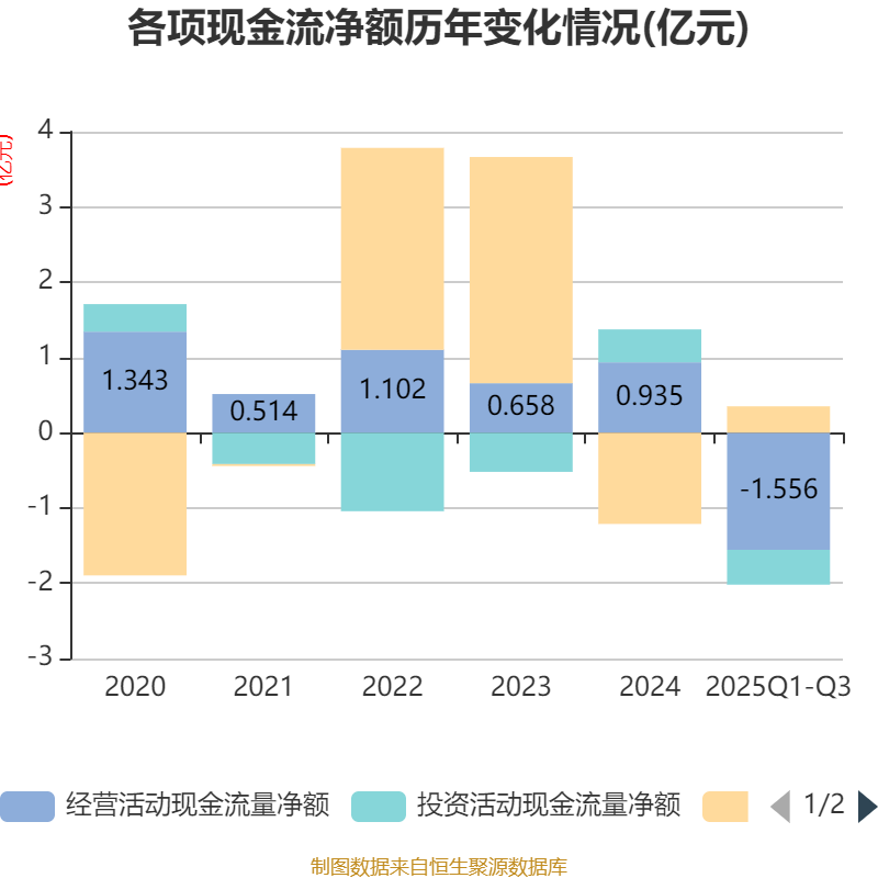 2025年前三季度,公司经营活动现金流净额为-1.56亿元,同比减少2522.87万元;筹资活动现金流净额3511.67万元,同比增加1.98亿元;投资活动现金流净额-4632.88万元,上年同期为-5869.36万元。