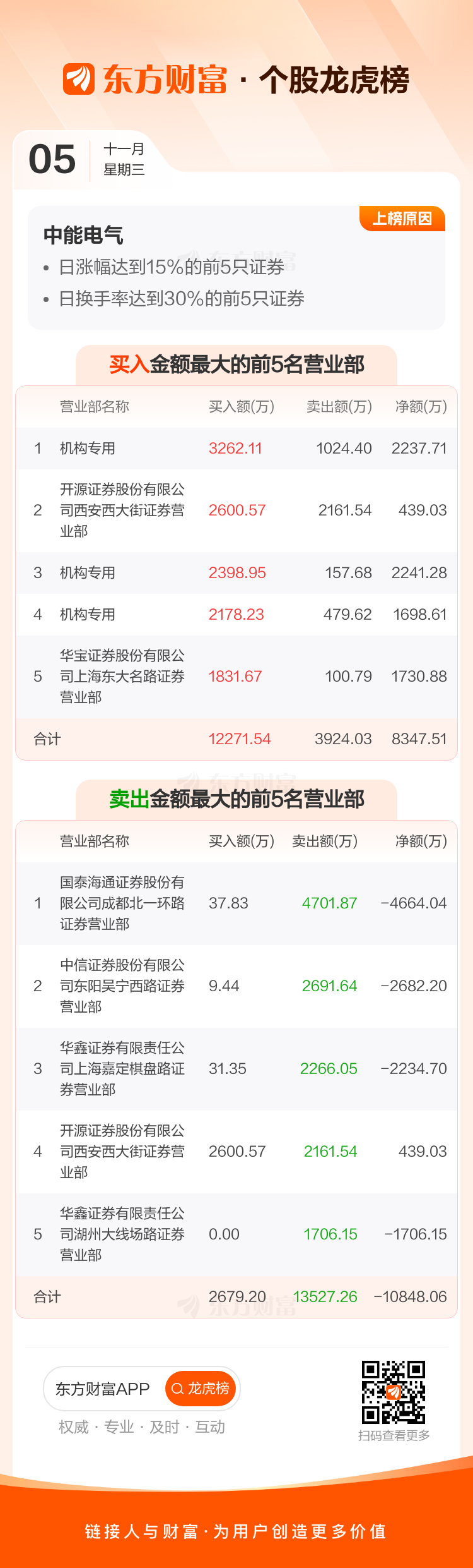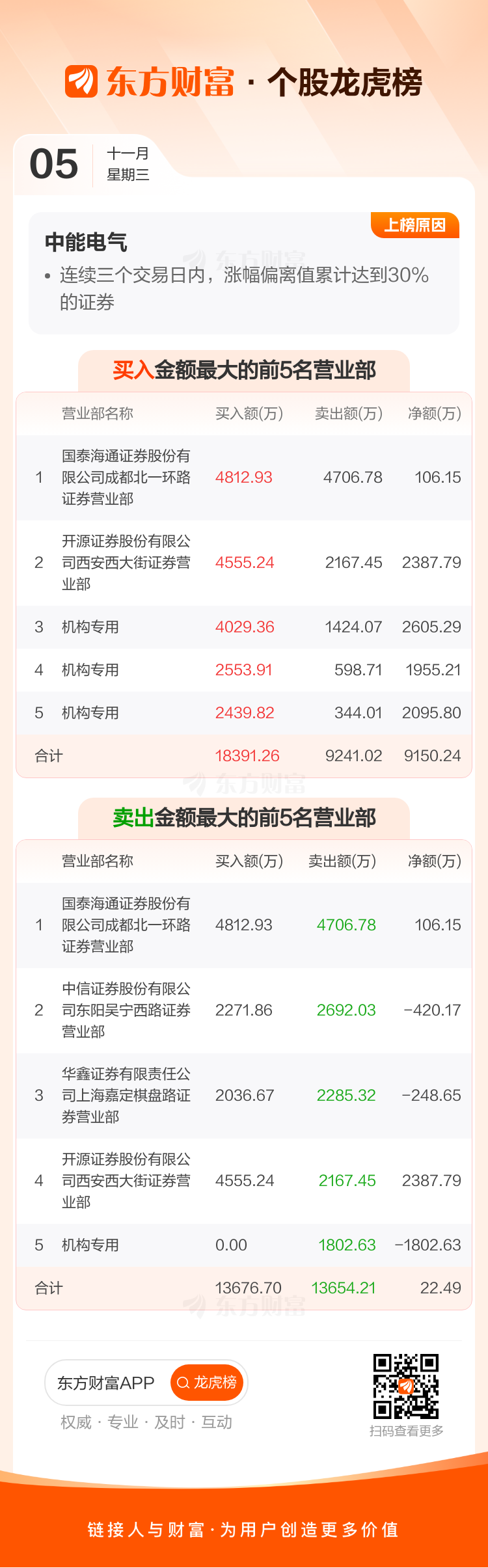 交易所2025年11月5日公布的交易公开信息显示,中能电气因成为日涨幅达到15%的前5只证券、日换手率达到30%的前5只证券、连续三个交易日内,涨幅偏离值累计达到30%的证券上榜。中能电气当日收报9.2元,涨跌幅19.95%,偏离值20.00%,换手率45.01%,成交额14.81亿。异常期间11月4日至11月5日,期间涨幅43.97%,累计偏离值45.05%,区间成交额20.93亿。