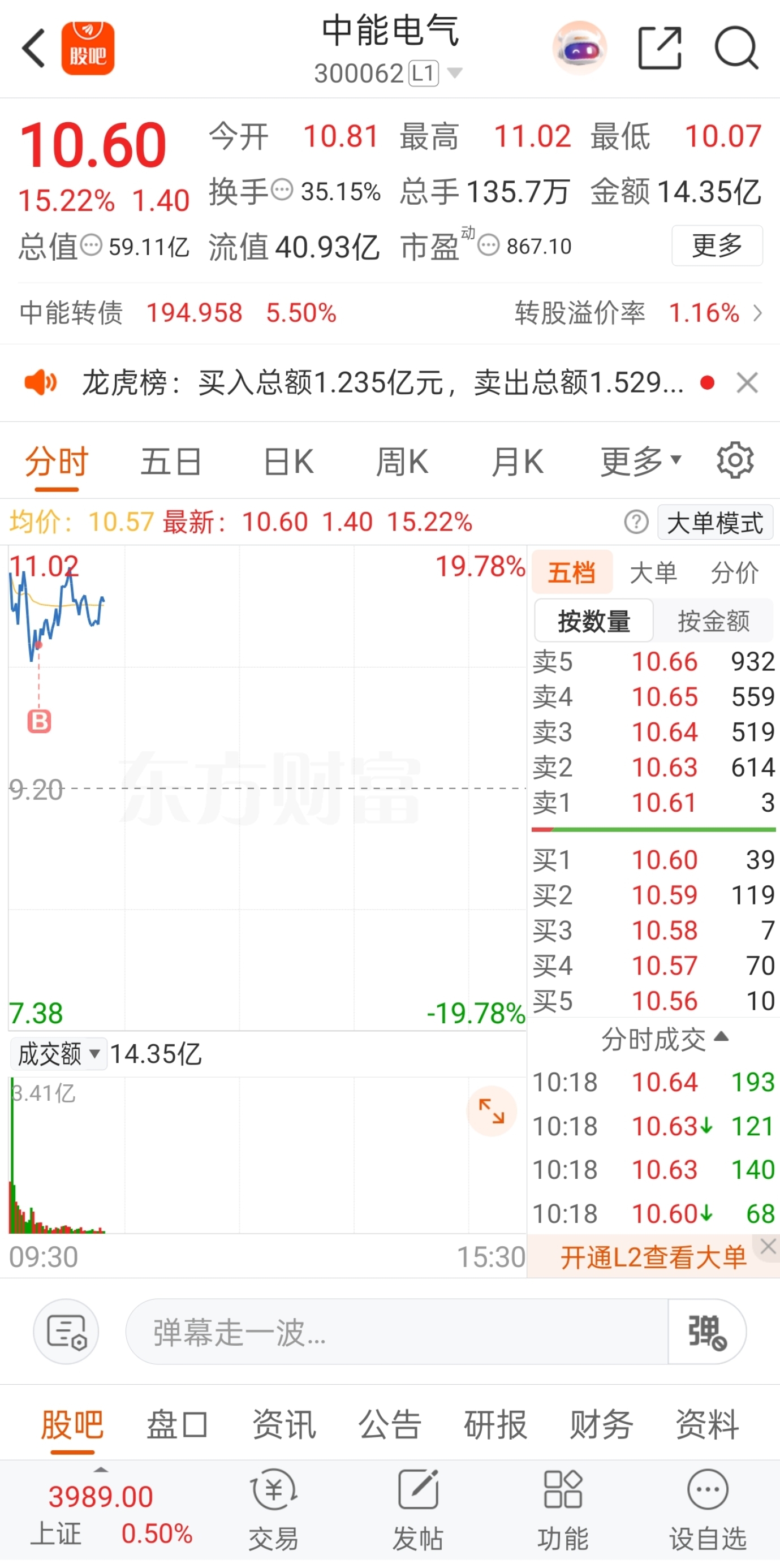 早盘大胆介入了个股$中能电气(SZ300062)$