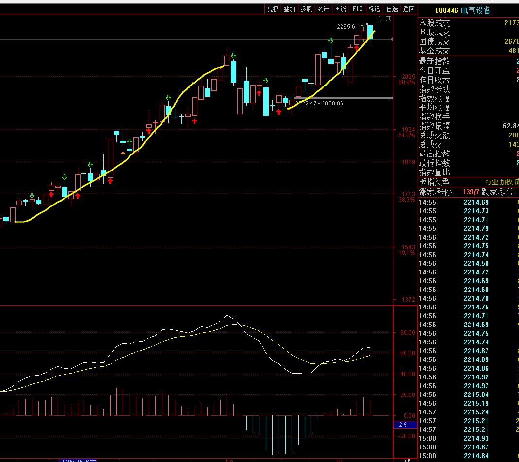 今天电气设备和光伏设备以及电池这里我要给大家浇一点冷水,上星期五直播间我就给大家讲了电气设备不太行,可能有回调,今天电气设备指数盘中跌了将近2%。电气设备指数而且是高位的穿头破脚的阴包阳走势,上星期五光伏设备和电池我是明着讲继续看多,但是现在通过60分钟和120分钟去看盘,电气设备有短期见顶的信号,光伏设备和电池明天如果不继续上涨也有可能见顶。在今天中午直播当中给大家多次提示到光伏设备大家不要再去追了。底部还没有怎么动的是周线反转的光伏设备个股还可以看一看,其他出现大阳线的个股一定不要去追涨。在电池领域,我们手中还有一个st众合科技,300477 ST合纵我第1次买入是在9月5号2.17成交的,后来套了百分之十几,第2次买入是10月21号,总共10万股。成本价2.02,这6天ST合纵大涨40%,看看仓位