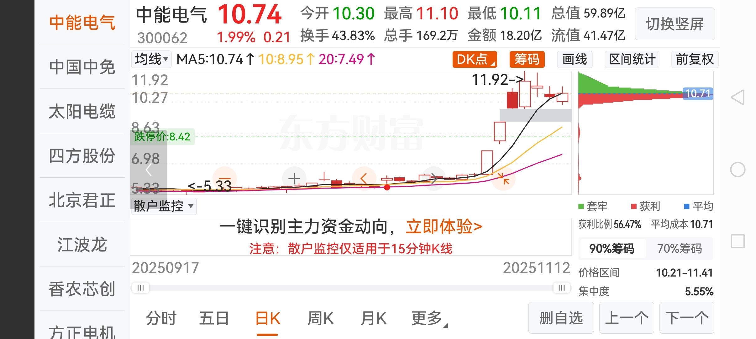 $中能电气(SZ300062)$ 这股要看筹码峰,底部差不多都走光了,平均价较集中,如果是真实的话,以目前量价是非常肯定看多的。但也有可能是主力对倒上来,毕竟短期高位做盘是存在较大可能,看榜机构与散户交易量能挺大,不大像现是做局为了出货,个人观点!