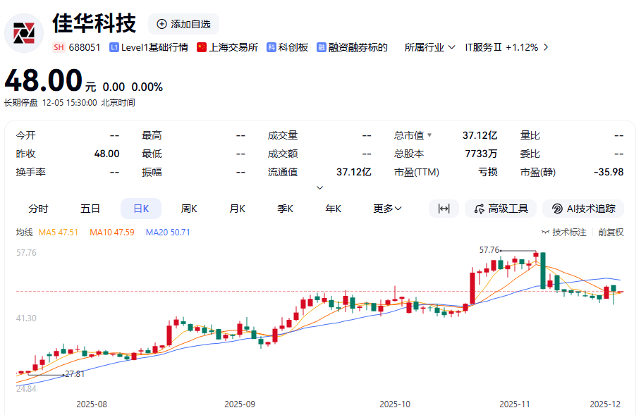 停牌前,佳华科技股价报48元/股,总市值37.12亿元。