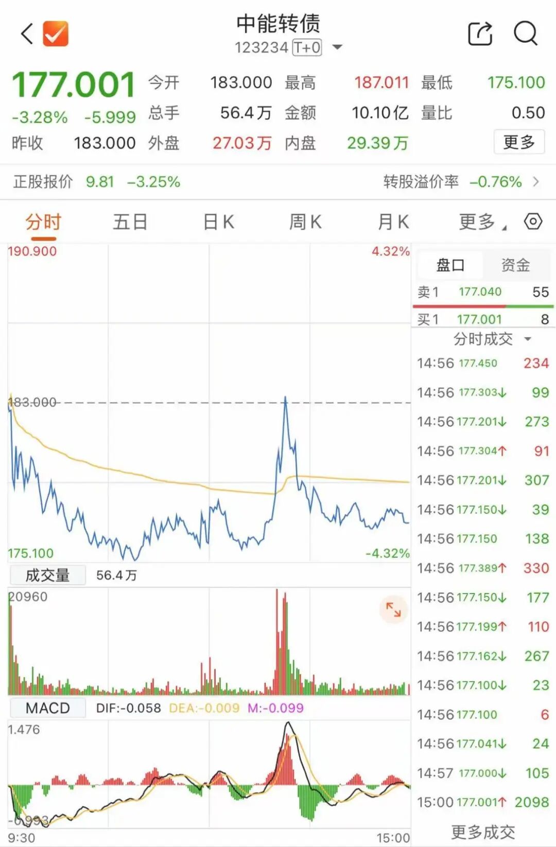 截至12月9日收盘,中能转债价格为177.001元/张。对照100.01元/张的强赎价格,投资者若是未及时操作,或将亏损超43%。截至目前,中能转债仍有1.00亿元余额尚未完成交易或转股,所占比例达25%。