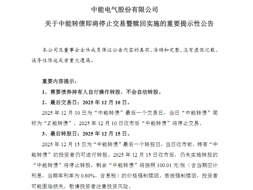 中能电气发布关于中能转债即将停止交易暨赎回实施的重要提示性公告,提醒投资者12月10日为中能转债最后一个交易日,12月15日是最后一个转股日,债券持有人应及时卖出或转股。12月15日收市后,未实施转股的中能转债将全部冻结,停止交易和转股。