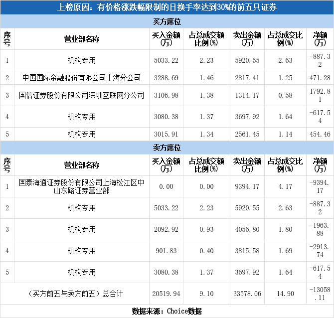 深交所2025年12月15日交易公开信息显示,中能电气因属于有价格涨跌幅限制的日换手率达到30%的前五只证券而登上龙虎榜。中能电气当日报收11.16元,涨跌幅为3.53%,换手率44.16%,振幅9.00%,成交额22.54亿元。