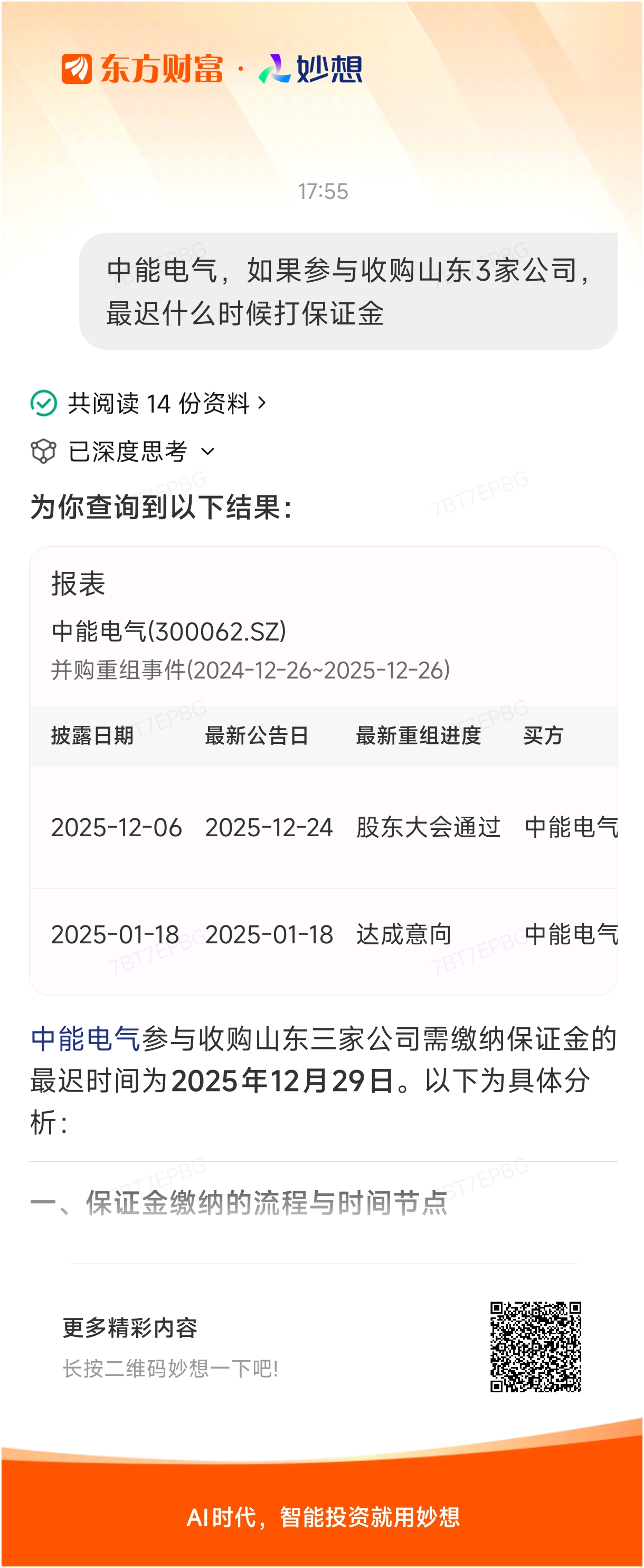 中能电气$中能电气(SZ300062)$ $太阳电缆(SZ002300)$ ,中能电气参与收购山东3家公司,最迟什么时候打保证金@妙想