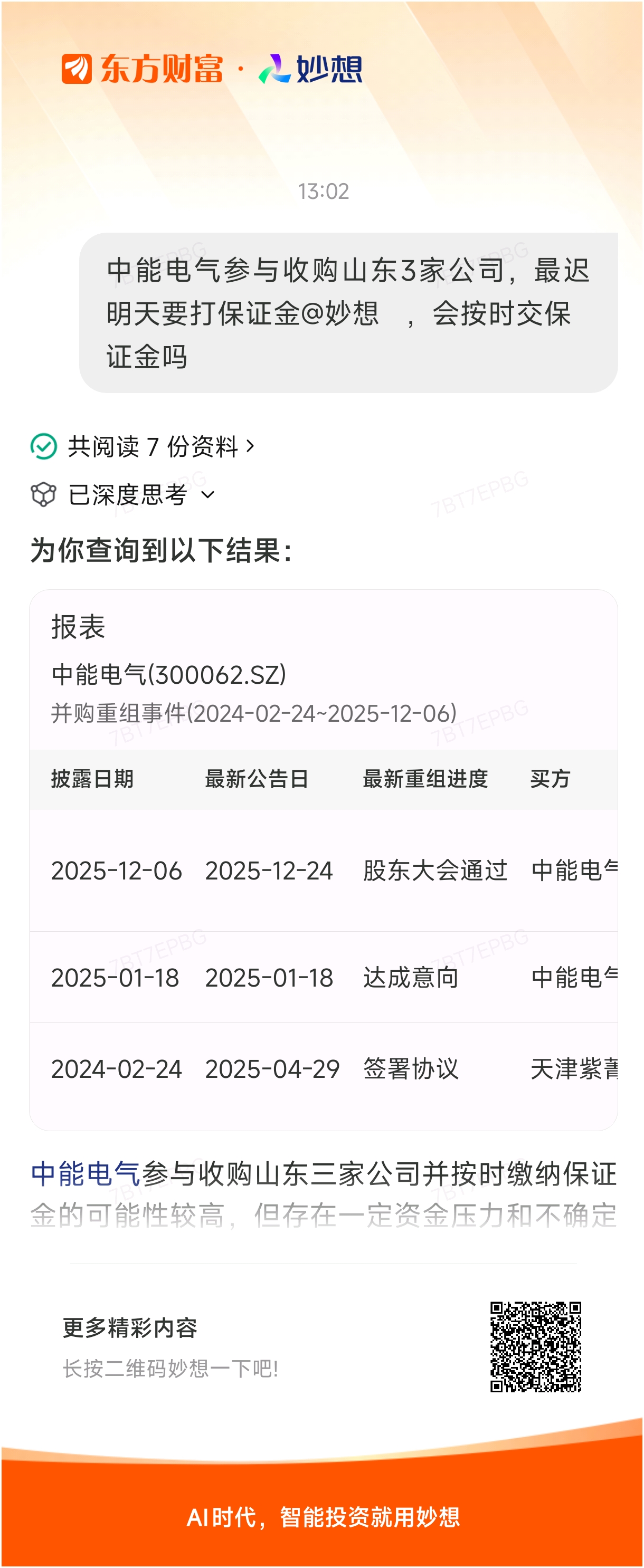 #@妙想 ,你怎么看?# 妙想一下:中能电气参与收购山东3家公司,会按时交保证金吗@妙想 $中能电气(SZ300062)$