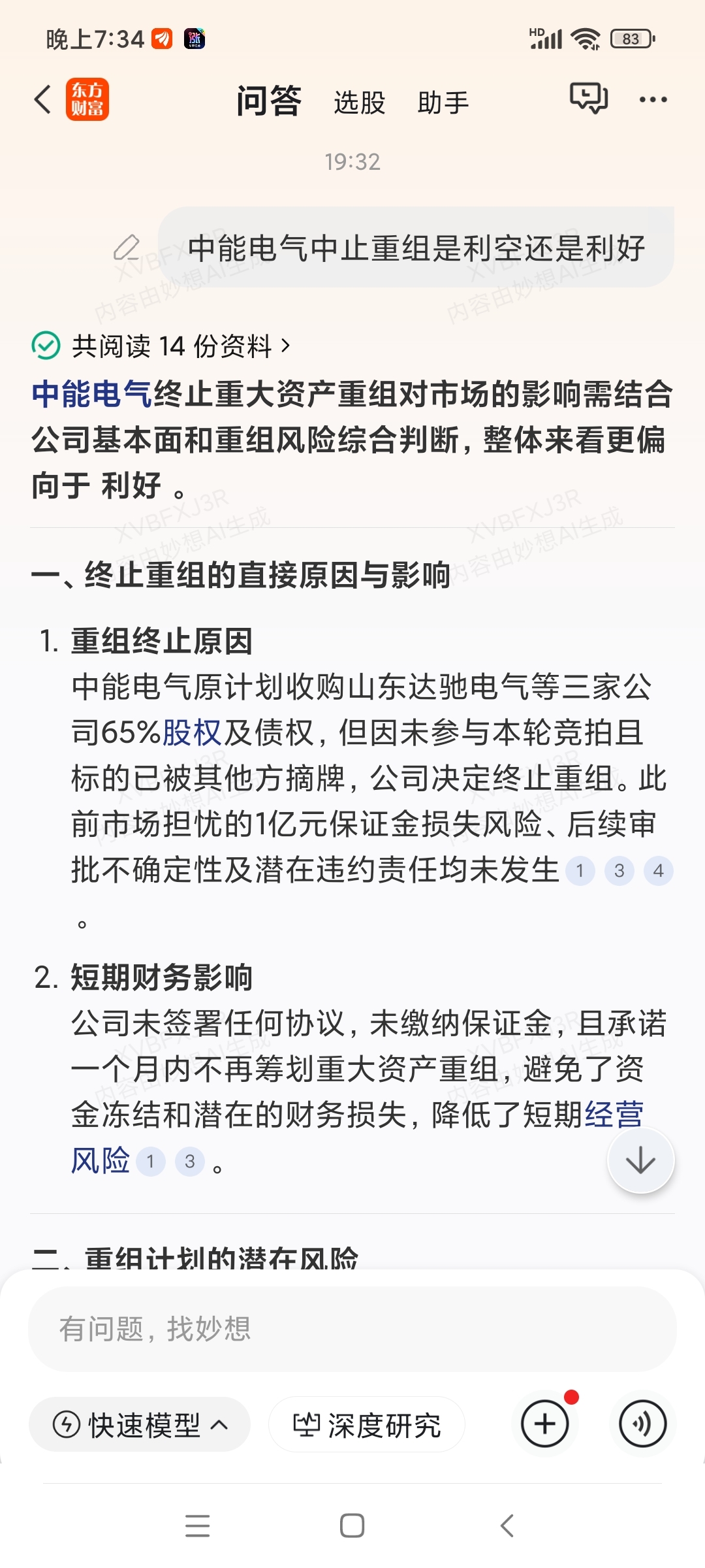 $中能电气(SZ300062)$ 终止重组是利好?东财AI解答