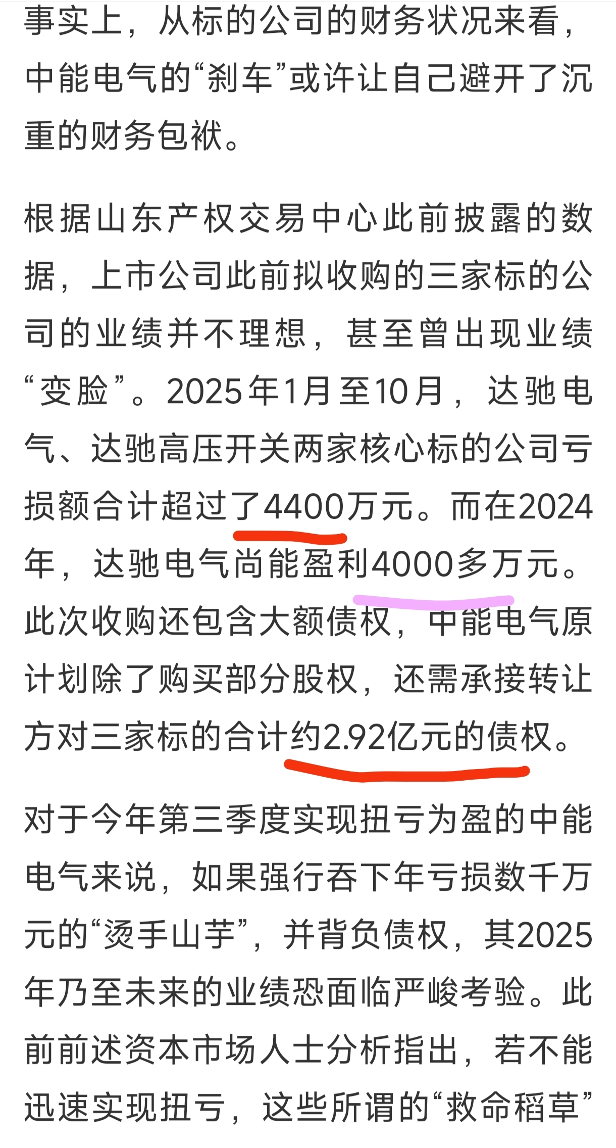 根据山东产权交易中心此前披露的数据,上市公司此前拟收购的三家标的公司的业绩并不理想,甚至曾出现业绩“变脸”。2025年1月至10月,达驰电气、达驰高压开关两家核心标的公司亏损额合计超过了4400万元。而在2024年,达驰电气尚能盈利4000多万元。此次收购还包含大额债权,中能电气原计划除了购买部分股权,还需承接转让方对三家标的合计约2.92亿元的债权