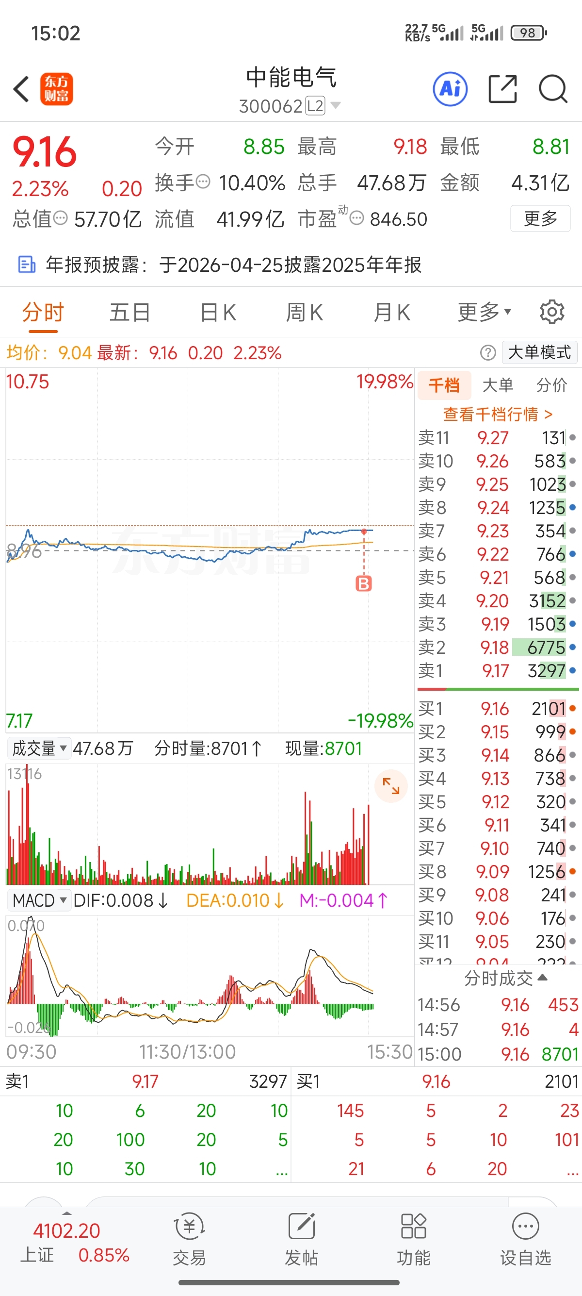 $中能电气(SZ300062)$ 什么情况?我还以为今天吃面了,尾盘这么多买单,我直接追了进去,希望明天吃肉