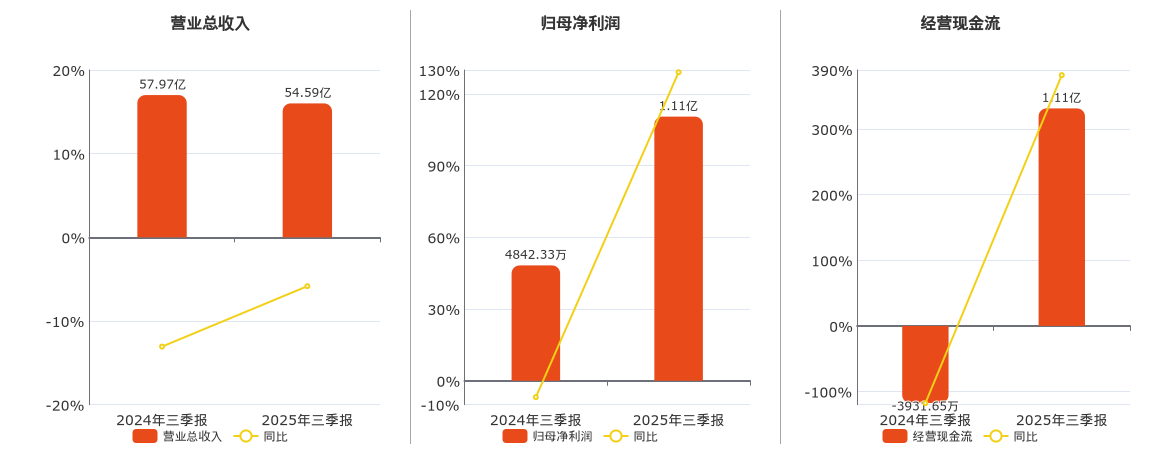 公司营业总收入为54.59亿元,较去年同报告期营业总收入减少3.38亿元,同比较去年同期下降5.84%。归母净利润为1.11亿元。经营活动现金净流入为1.11亿元。