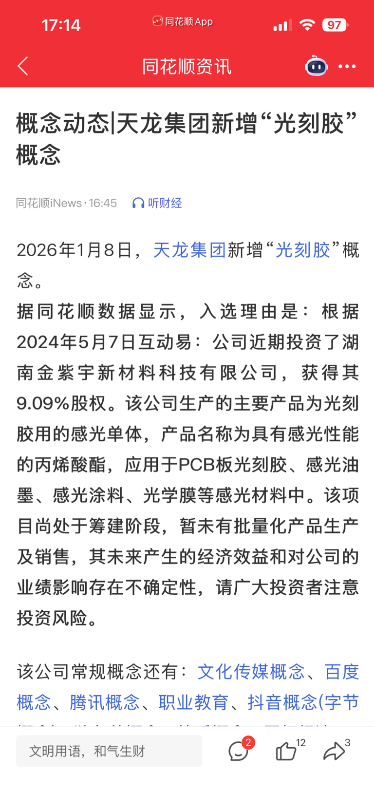 $天龙集团(SZ300063)$ 光刻胶