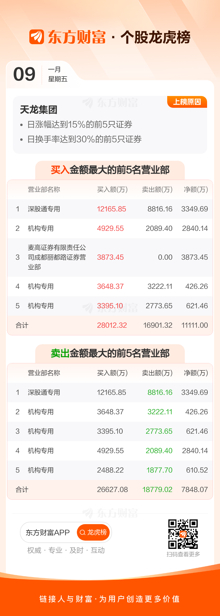 交易所2026年1月9日公布的交易公开信息显示,天龙集团因成为日换手率达到30%的前5只证券、日涨幅达到15%的前5只证券上榜。天龙集团当日收报10.85元,涨跌幅20.02%,偏离值42.30%,换手率42.29%,成交额27.59亿。