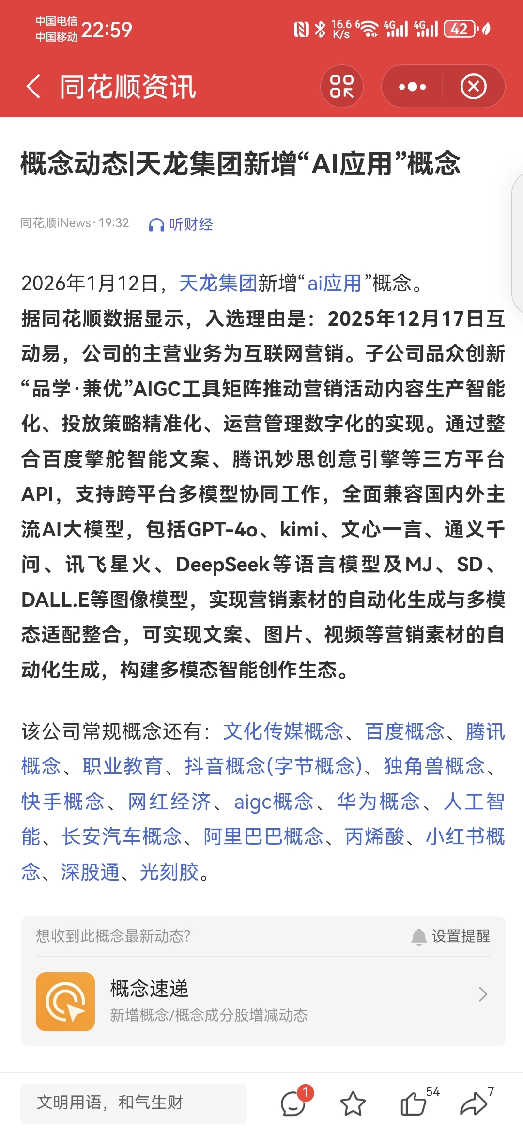 $天龙集团(SZ300063)$ 同花顺新增概念:AI应用