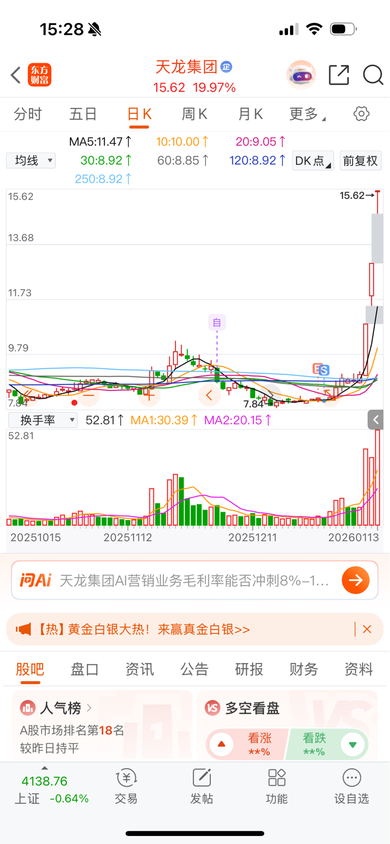 $天龙集团(SZ300063)$ 今天回上万的举手
