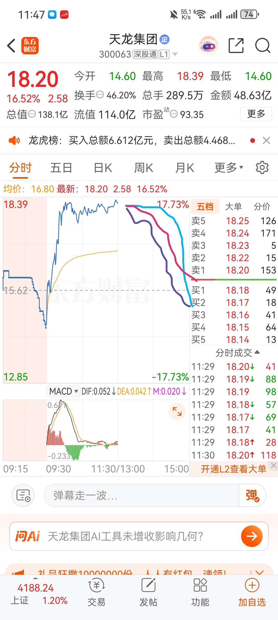$天龙集团(SZ300063)$ 下午肯定会跌下来的,个人比较偏向蓝色线条走势,收盘翻绿1-3个点,明天低开杀跌。