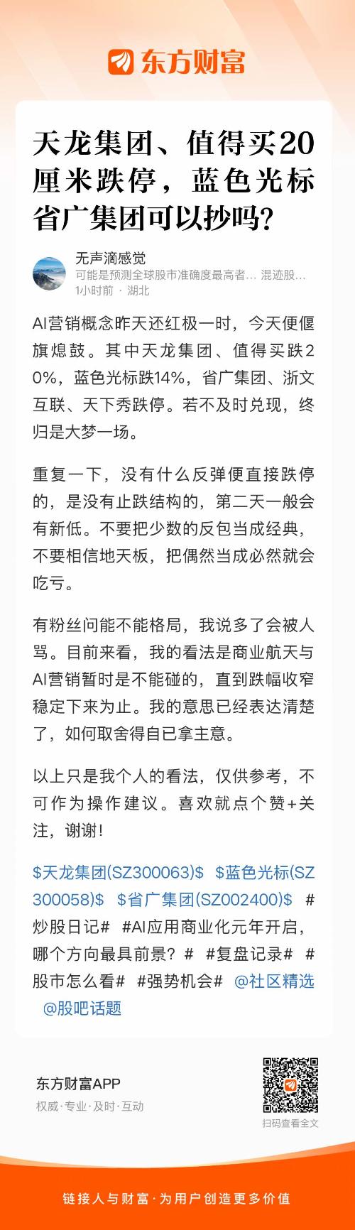 AI营销概念昨天还红极一时,今天便偃旗熄鼓。其中天龙集团、值得买跌20%,蓝色光标跌14%,省广集团、浙文互联、天下秀跌停。若不及时兑现,终归是大梦一场。