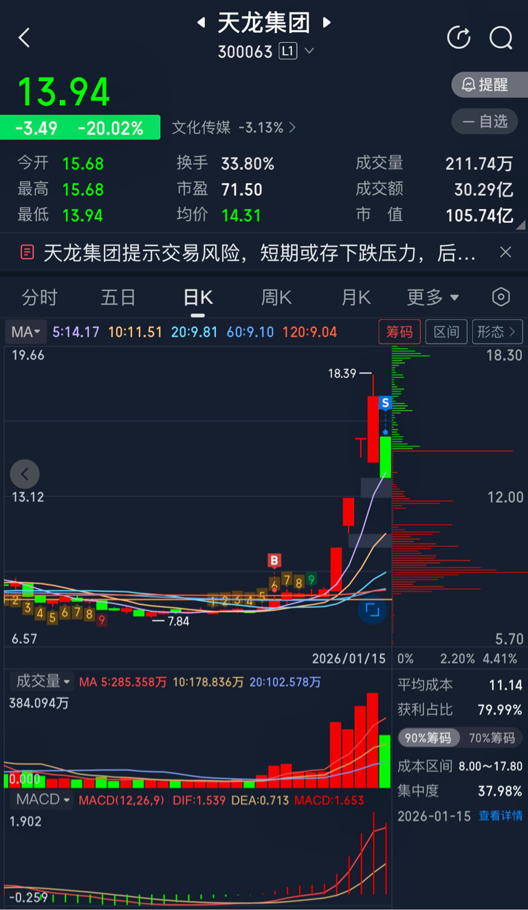 市场过热,被强监管,枪打出头鸟,只能提前下车。关注了大半年,记录开年第一个强势股,买在启动时,虽未卖在高点,也知足,感谢主力,祝大家新年发大财。