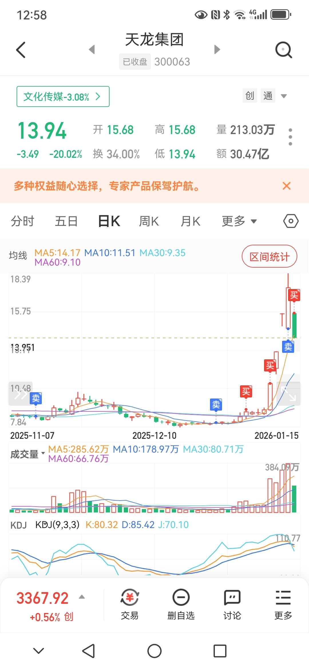 9.4启动哪天全仓天龙,昨天放了天量18全部清仓完了,挣39个多,今天跌停13.