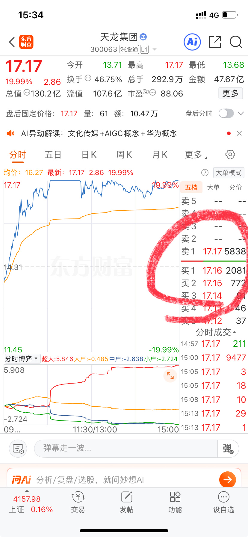 $天龙集团(SZ300063)$ 这个算涨停了不?还是竞价漏单了?差一分?