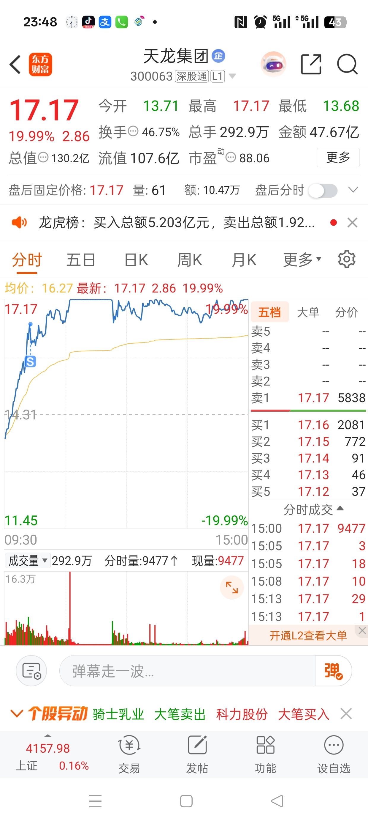 $天龙集团(SZ300063)$ 开盘没加仓是今天最大的败笔,在航天电子和天龙之间选择了加仓航天电子,结果……