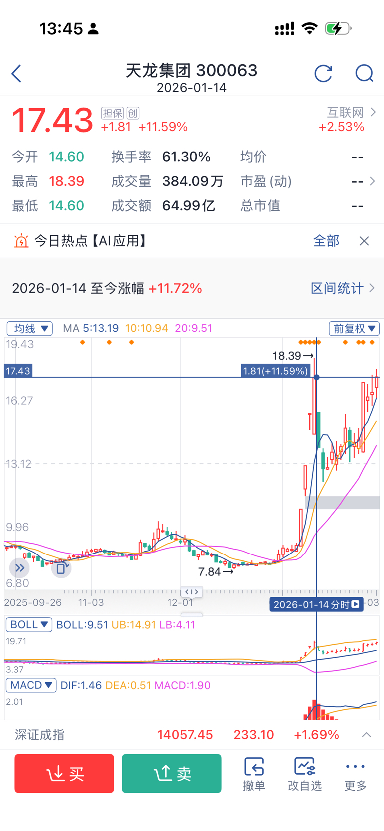 今天收盘前必冲破18.39元,我看好天龙集团,腾讯元宝10亿红包,和抖音拿下春晚