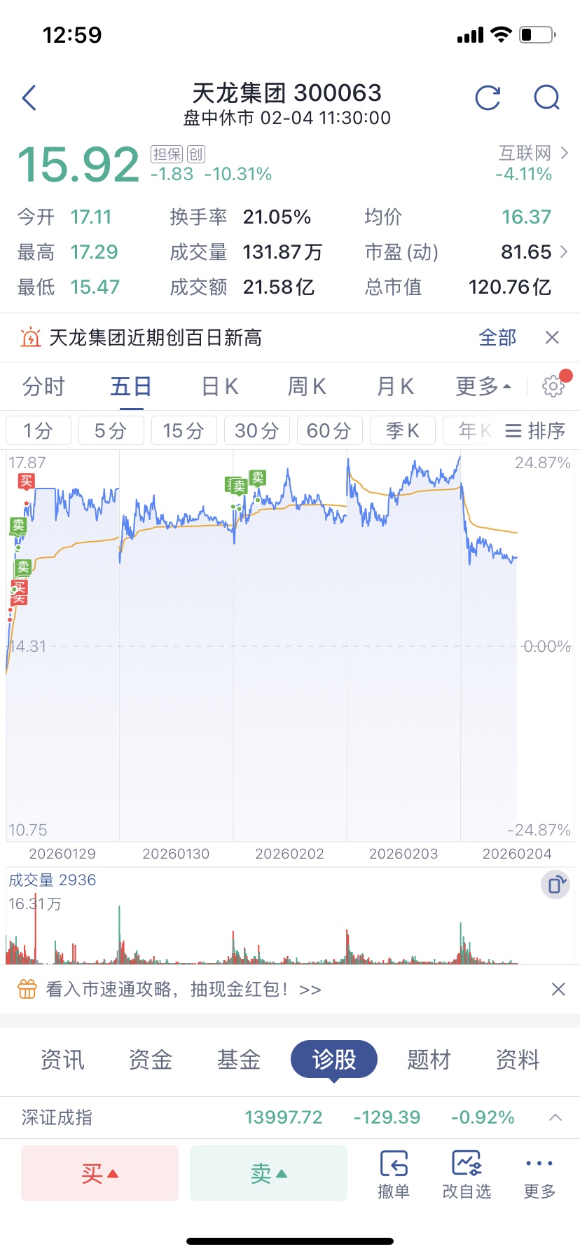 $天龙集团(SZ300063)$ 昨夜复盘看了天龙的,感觉量价配合完美,打算今天早盘竞价出了航天,再买回天龙的,哪知道会跌成这样?只好买蓝色,感觉他扛揍点,前两天消化了短期减持带来的利空因素,哪晓得,越买越跌,现在躺平了
