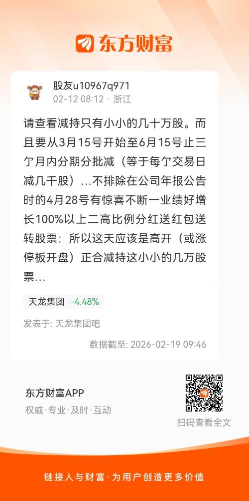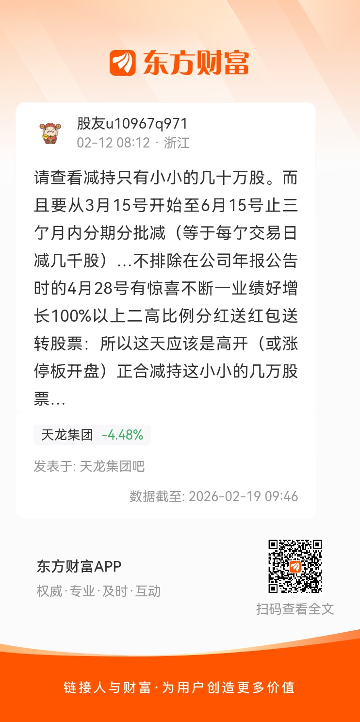 请查看减持只有小小的几十万股。而且要从3月15号开始至6月15号止三亇月内分期分批减(等于每亇交易日减几千股)…不排除在公司年报公告时的4月28号有惊喜不断一业绩好增长100%以上二高比例分红送红包送转股票:所以这天应该是高开(或涨停板开盘)正合减持这小小的几万股票…