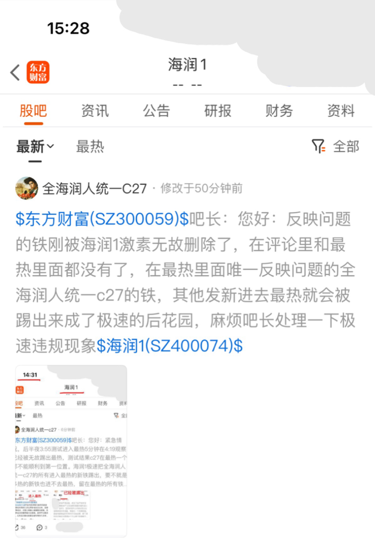 $金刚退(SZ300064)$ 吧长:您好:海润1紧急情况看15:28截图极速把全海润人统一c27找吧长反映问题的铁私自隐藏了,麻烦吧长帮助解决一下,目前进入最热的新铁都被踢被臣麻烦吧长帮助解决一下极速这种对无股人友好对有股人踢的行为谢谢$海润1(SZ400074)$