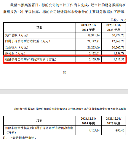 交易预案显示,海兰寰宇具有较强的盈利能力。2023年、2024年,海兰寰宇未经审计的归母净利润分别为1212.57万元、5159.59万元;扣非后净利润分别为-890.40万元、4105.64万元。