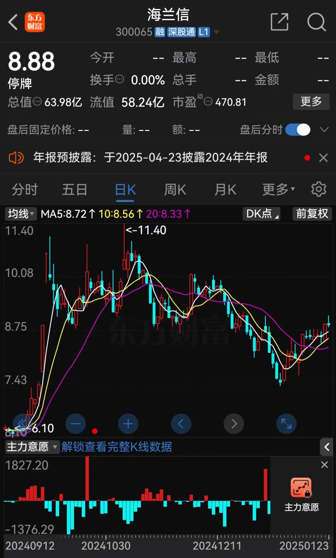 海兰信自1月24日开市起停牌,计划自2月17日开市起复牌。截至1月23日收盘,公司股价报8.88元/股,总市值为63.98亿元。截至2024年9月30日,公司股东有4.571万户。