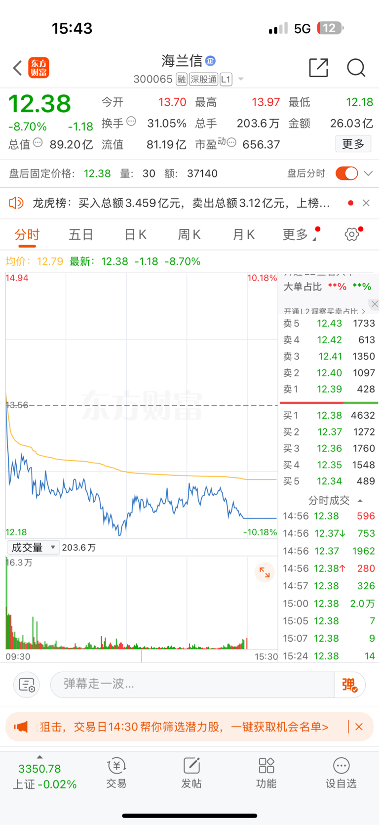 $海兰信(SZ300065)$ 最后两分钟12.38洗了两万多手 还有四千多手没人卖 明天来个一字头没啥压力