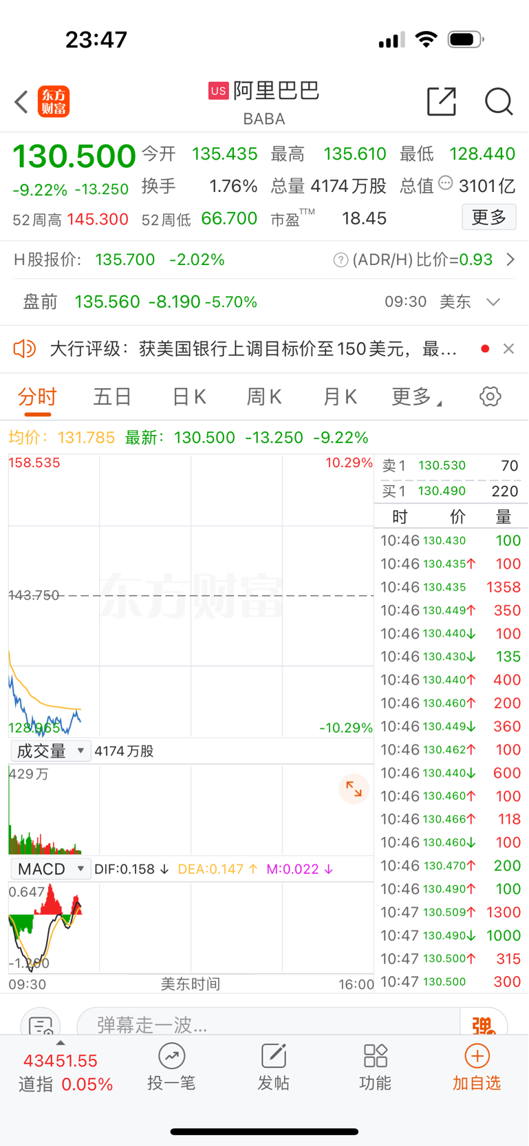 阿里美股市场当前跌了9个多点了