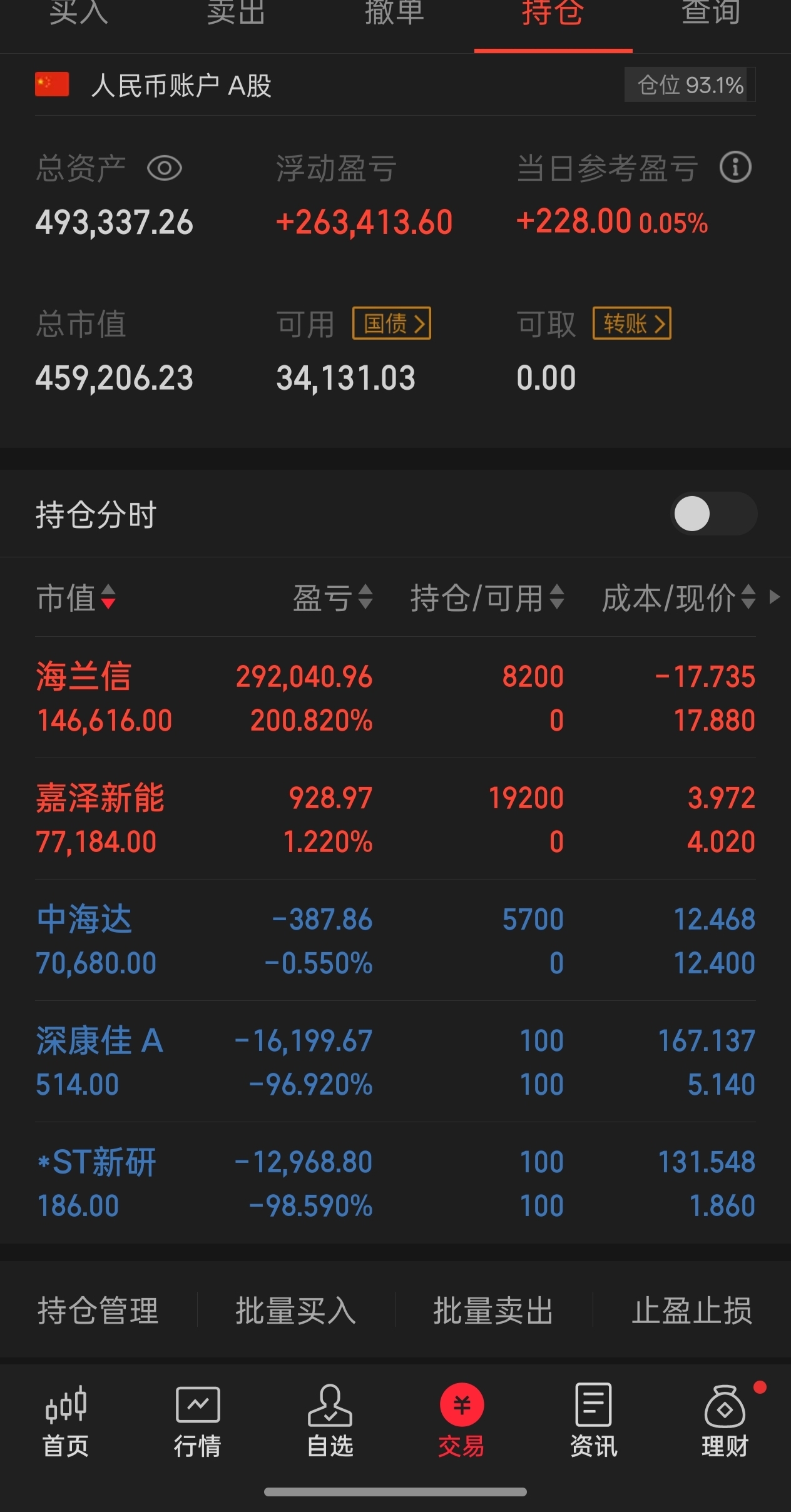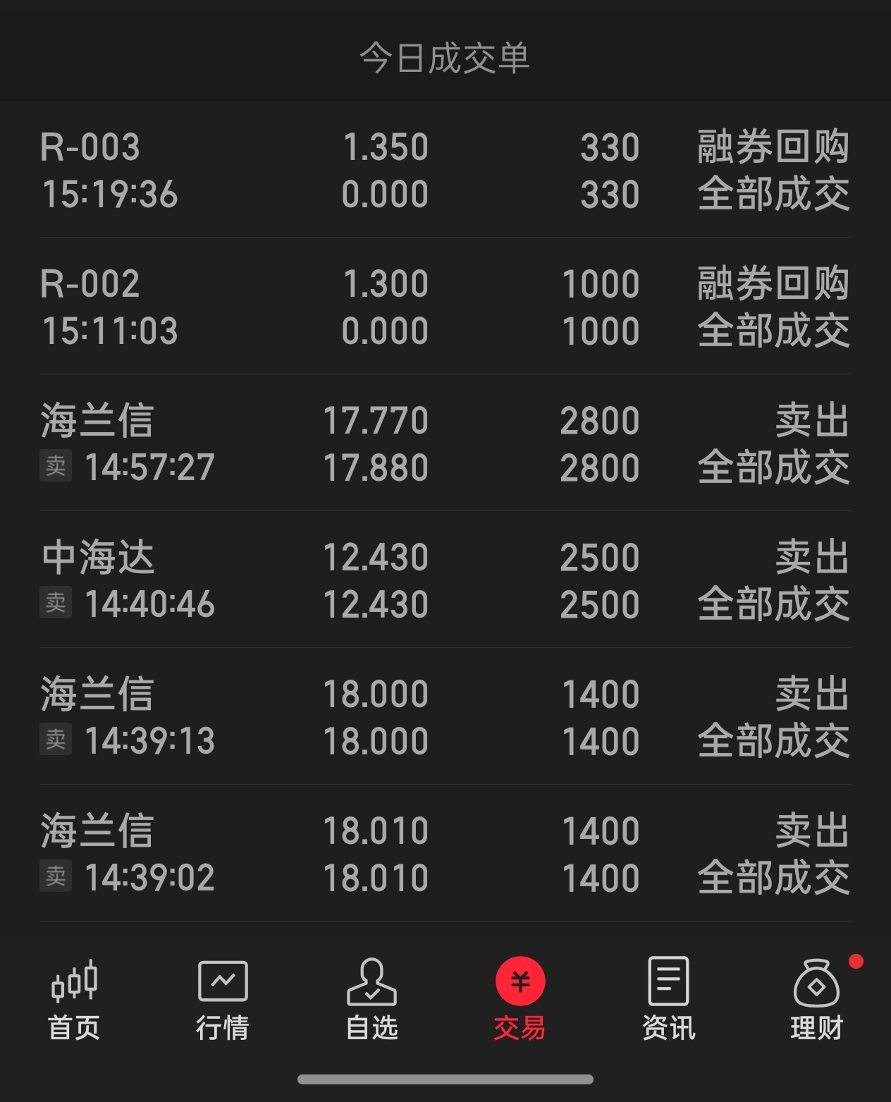$海兰信(SZ300065)$ 大幅减仓了,从去年9月满仓海兰信之后,一直到上周五,一直满仓海兰信。现在只剩下上周五仓位的四分之一不到,我害怕了,我先撤了,祝留下的老铁们发财。因为我还是克服不了贪婪的心理,不会做T,另外,现在鱼尾行情了,我必须大幅减仓了。前两天还了杠杆,今天做了逆回购,防止明天手贱又追高。等回调结束企稳后再接回,如果不回调,那也与我无关,和海兰信的缘分到此了