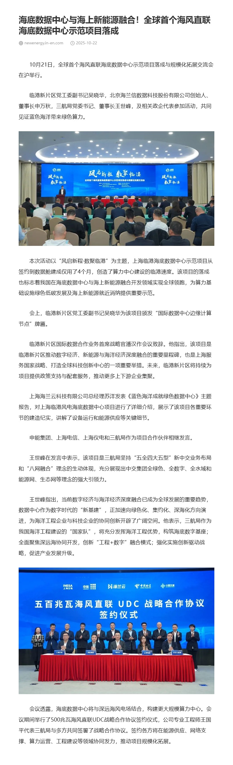 海底数据中心与海上新能源融合!全球首个海风直联海底数据中心示范项目落成