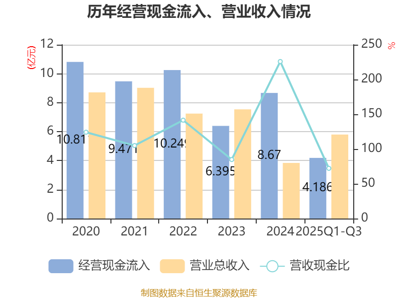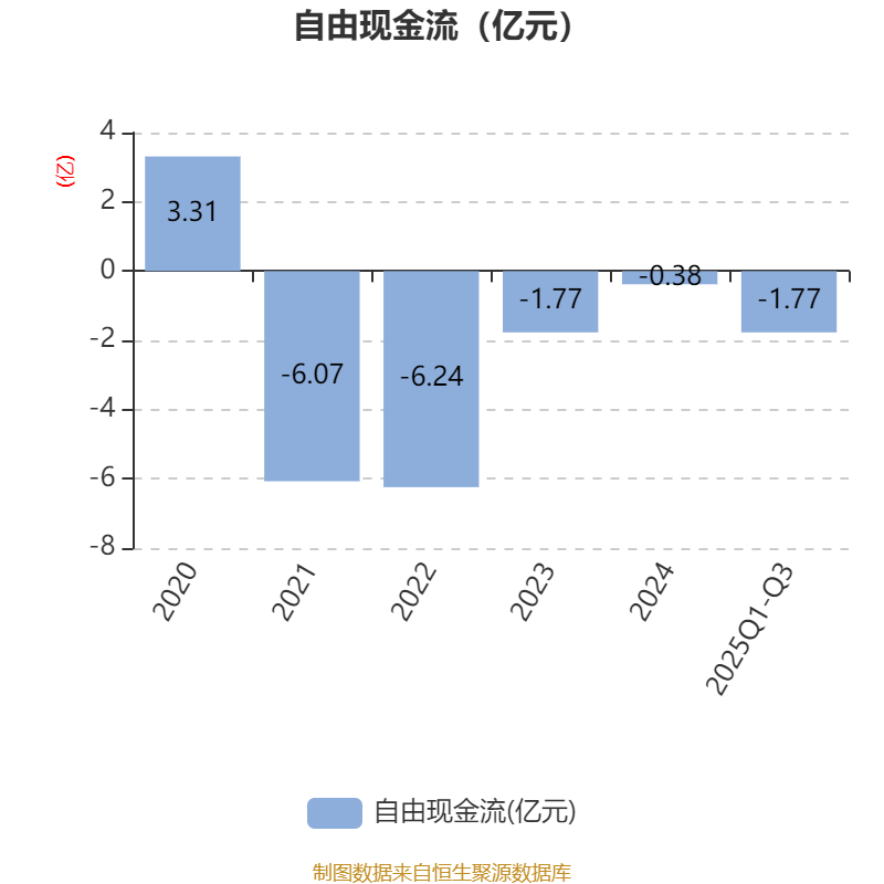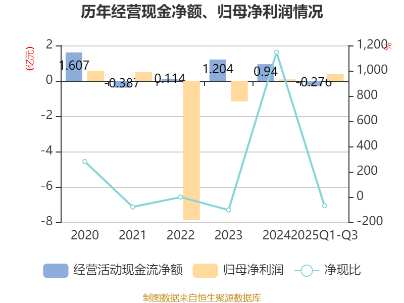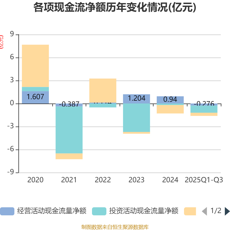 2025年前三季度,公司经营活动现金流净额为-2764.49万元,同比减少3705.33万元;筹资活动现金流净额-4117.02万元,同比增加2520.44万元;投资活动现金流净额-9281.78万元,上年同期为-1.41亿元。