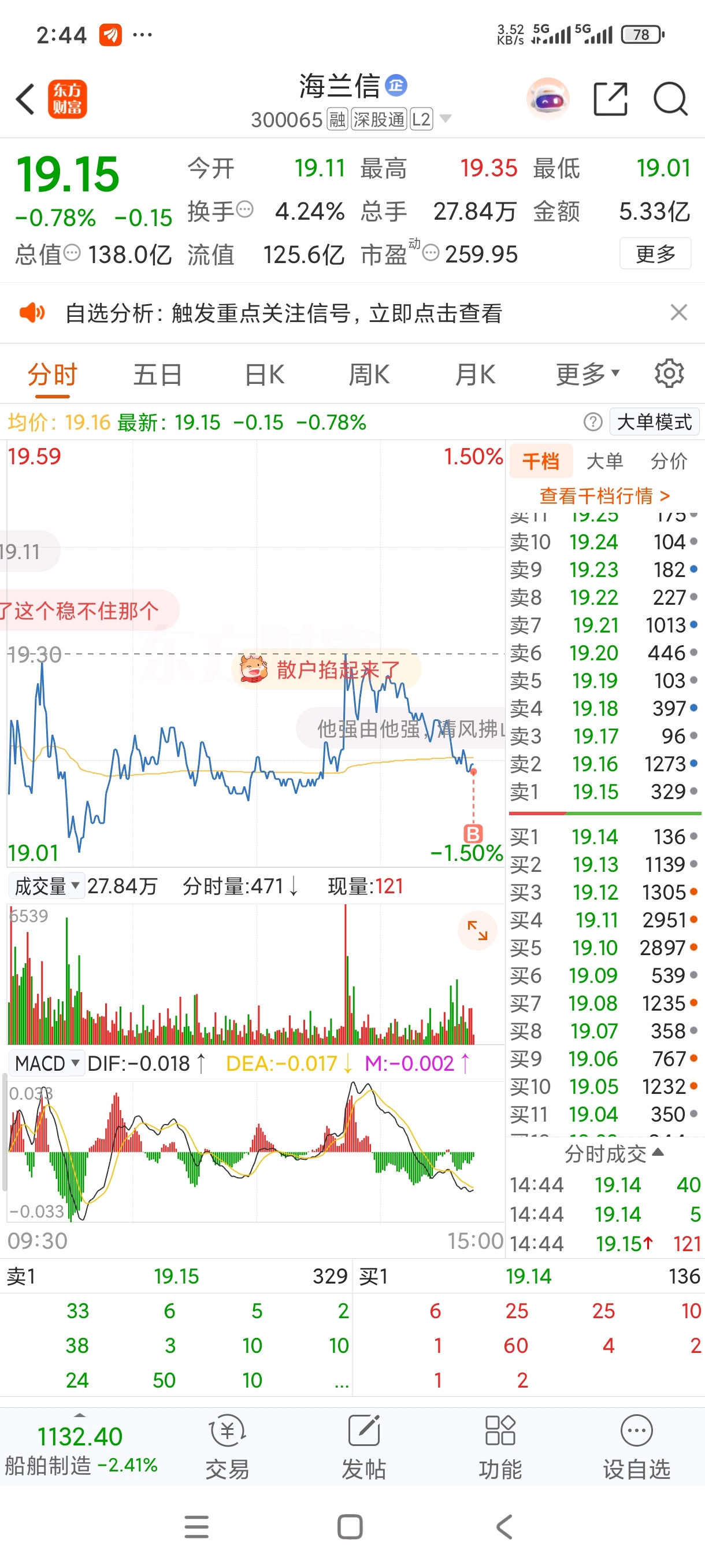$海兰信(SZ300065)$ 等明天!