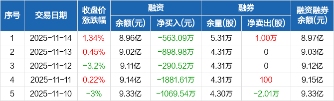 海兰信融资融券信息显示,2025年11月14日融资净偿还563.09万元;融资余额8.96亿元,较前一日下降0.62%。