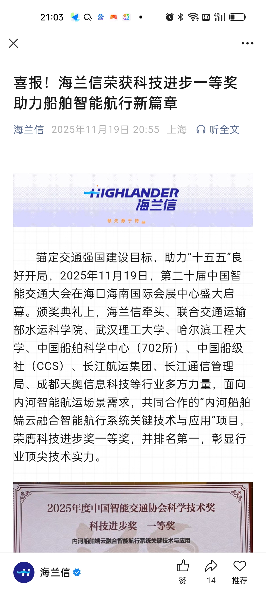 $海兰信(SZ300065)$ 海兰信又获奖了