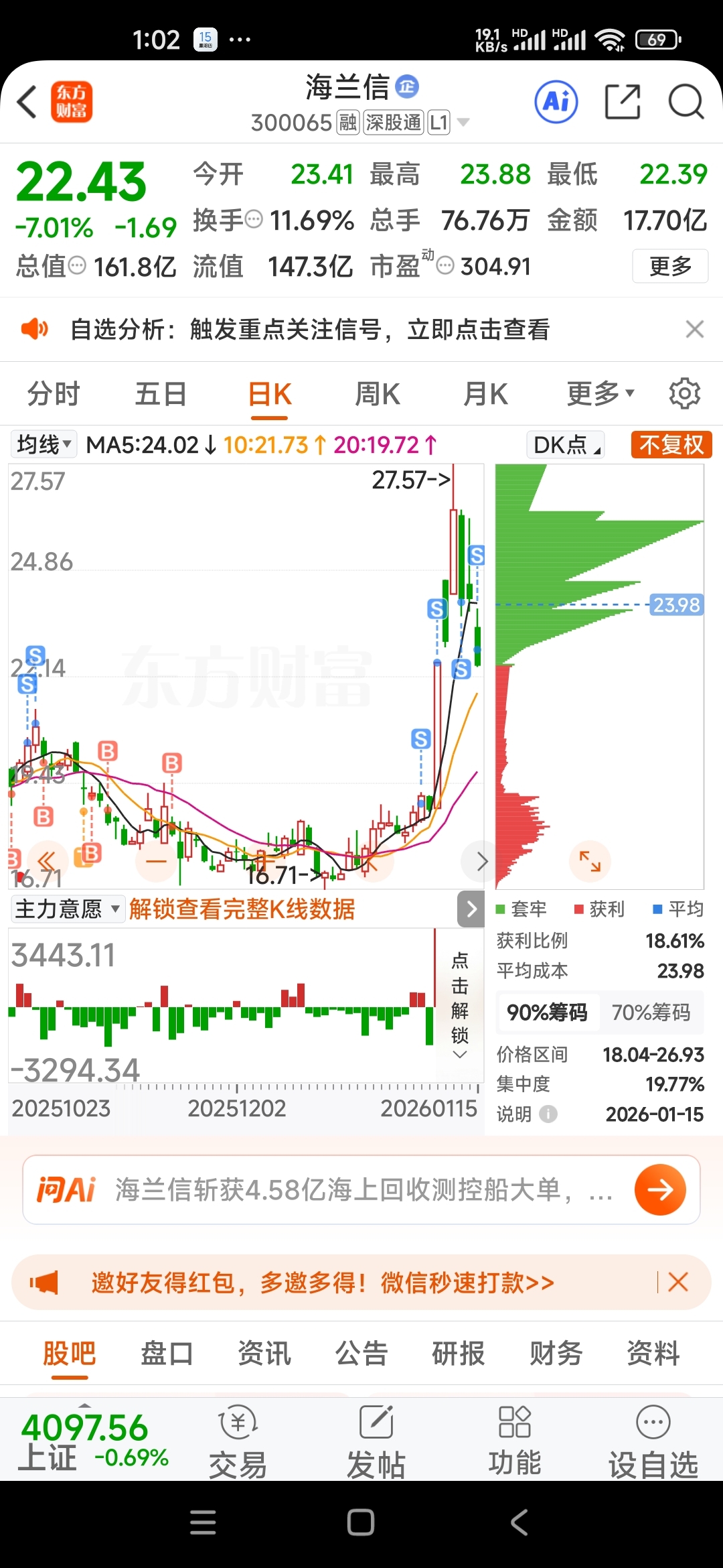 24减仓,今天23.85全部清仓,利润从高位下来回吐十几个点,落袋为安吧!等企稳,我还会回来的