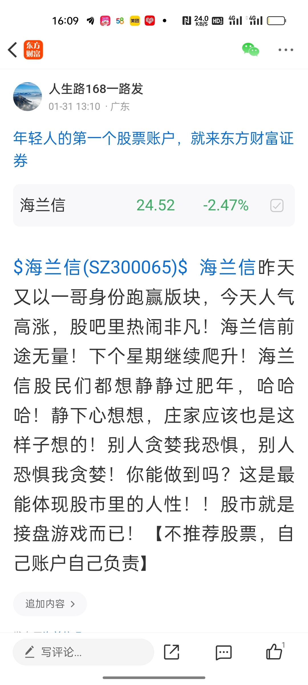 温馨提示: 1.根据《证券法》规定,禁止编造、传播虚假信息或者误导性信息,扰乱证券市场;2.用户在本社区发表的所有资料、言论等仅代表个人观点,与本网站立场无关,不对您构成任何投资建议。用户应基于自己的独立判断,自行决定证券投资并承担相应风险。《东方财富社区管理规定》