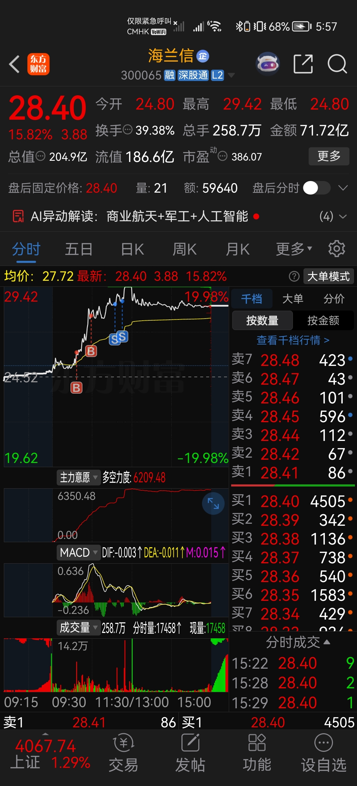 $海兰信(SZ300065)$ #复盘记录# 感觉第二笔进的价格有点不太理智,日内做个T,摊薄点成本,今天商业航天走一致,怕明天分歧。