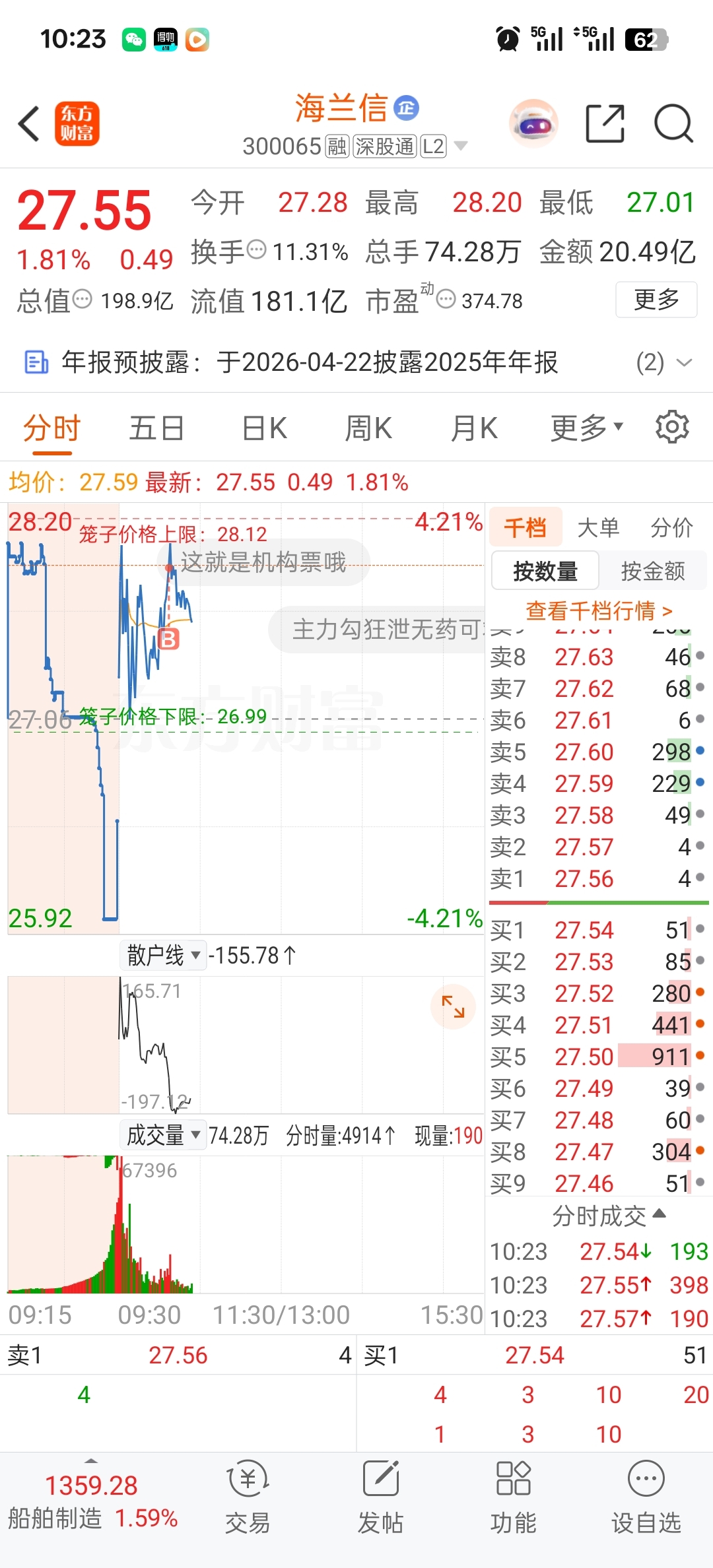 $海兰信(SZ300065)$ 兄弟们对不起,被我买下来了,
