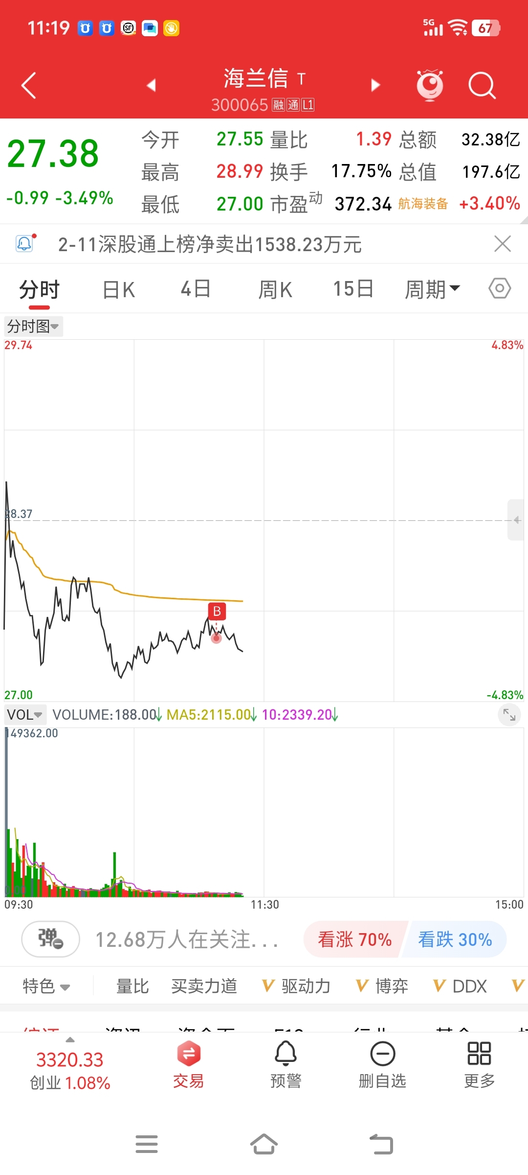 挂的29.67T出,午后大盘跳水,希望这票走不寻常路,这样才会引起场外散户注意,
