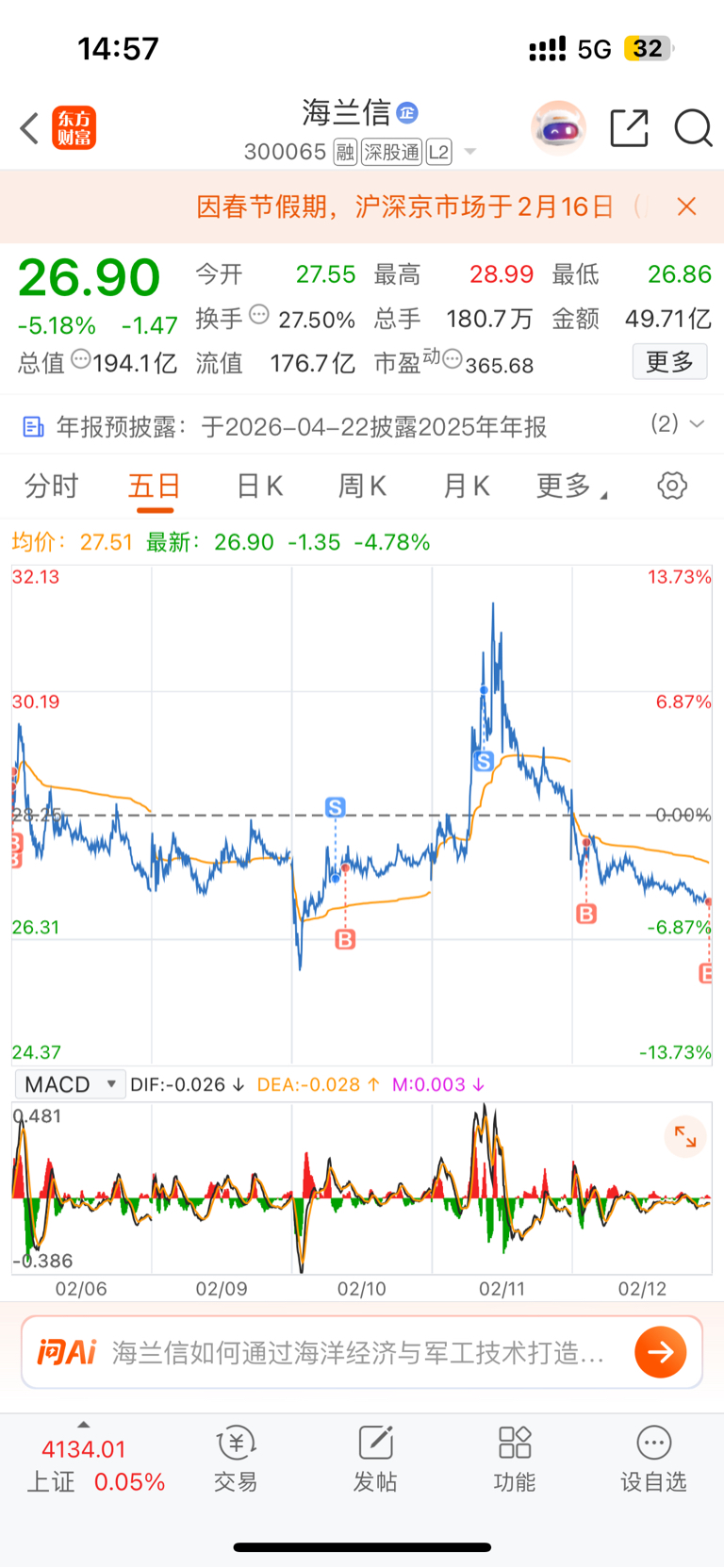 $海兰信(SZ300065)$ 今天不是卖点,敌进我退,敌退我进。
