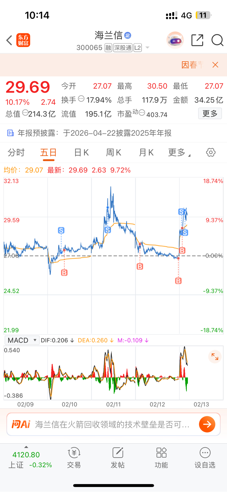 $海兰信(SZ300065)$ 看样子是走趋势了,尾盘接回来