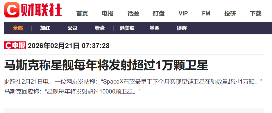 马斯克称星舰每年将发射超过1万颗卫星
