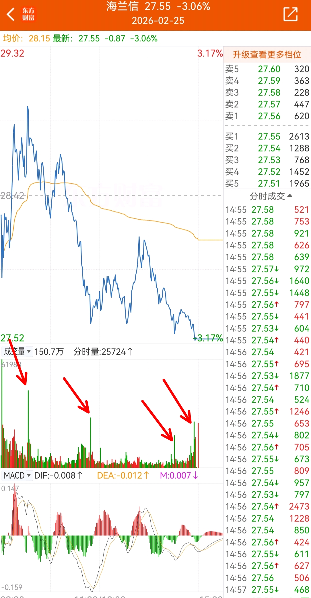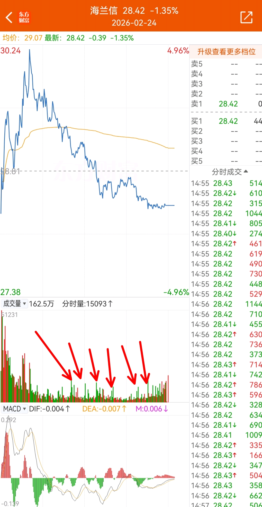$海兰信(SZ300065)$ 昨天接筹码的大部分百万级别小资本,那么今天接筹码的四大千万级别资本,能让海兰信的明天,掀起什么大风大浪呢,让我们拭目以待!这样的卖单量要是搁到其他不到200亿市值的股,早就跌8.9个点,海兰信两天才跌4个点,明着大单卖,暗地里小单不停买,表面恐慌,实际吃货。大单砸,小跌,只能说明海兰信还会继续创新高!我对海兰信一定也不担心